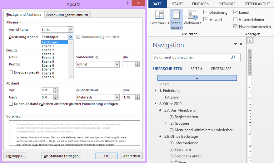 Wenn Sie einen Absatz mit einer Gliederungsebene formatieren (optimaler Weise benutzen Sie Formatvorlagen, in denen jeweils eine Ebene spezifiziert ist), dann haben Sie davon mehrere Vorteile.