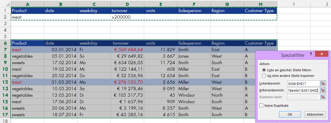 Wenn im Kriterienbereich mehrere Kriterien in der selben Zeile angegeben sind, so werden sie beim Filtern als mit einem logischen UND verbunden interpretiert. Das Ergebnis schließt also nur jene Daten ein, in denen alle in dieser Zeile spezifizierten Kriterien zutreffen (im Bild hellblau markiert).