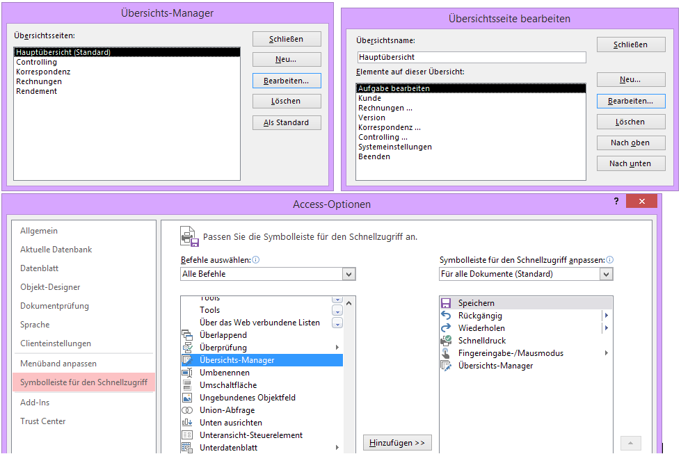 Wer so alt ist wie ich verwendet in Access „immer schon“ den Übersichts-Manager, um eine einfache Benutzerführung zu erzeugen. Das Tool ist nicht besonders hübsch, erlaubt aber, ein Formular zu generieren, das Haupt- und Untermenüsteuerung auf beliebig vielen Ebenen im Griff hat. Jedes Menü – jede Übersicht – wird dabei für sich konfiguriert; Sie können Formulare öffnen, Berichte anzeigen, die Anwendung beenden, Funktionen ausführen, …