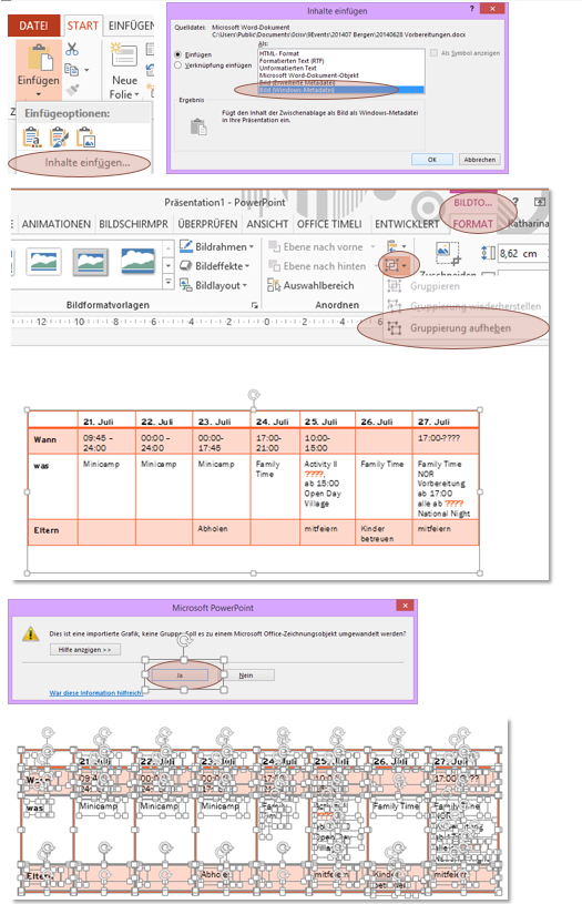 In der BILDTOOLS > FORMAT Registerkarte finden Sie nun in der Gruppe „Anordnen“ die Gruppierung. Sie können hier die Gruppierung aufheben. Lassen Sie sich von der Fehlermeldung nicht stören; Sie wissen, was Sie tun, und können die Frage ruhigen Gewissens mit „Ja“ beantworten.