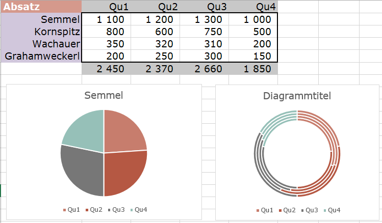 Wenn’s also eine runde Sache sein soll, aber der Datenbereich rechteckig ist, kann ich Ihnen das Ringdiagramm anbieten. Das stellt nun die Verteilung der Daten kreisfürmig dar, mit einem Ring für jede Kategorie.