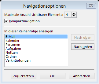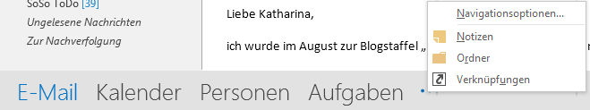 Ihr Navigationsbereich in Outlook ufert ein bissl aus? Eine ganze dicke fette Zeile, nur, um zwischen E-Mail, Kalender, Kontakten und Aufgaben wechseln zu können?