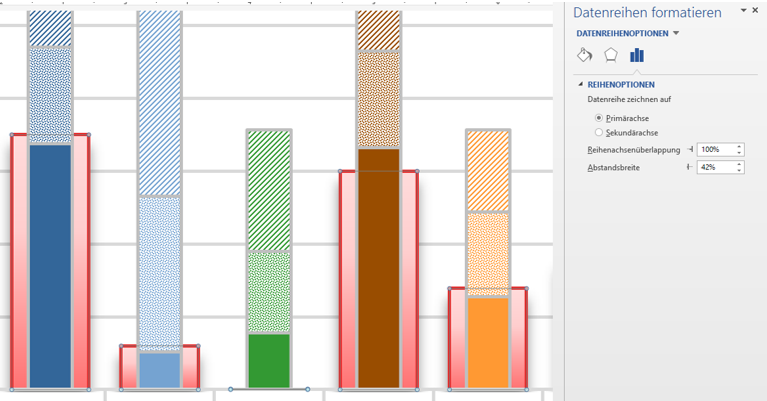 Klicken Sie für die breitere Säule mit der rechten Maustaste auf die Datenreihe, die nun hinten liegt, wählen Sie Datenreihe formatieren, und ändern Sie die Abstandsbreite.