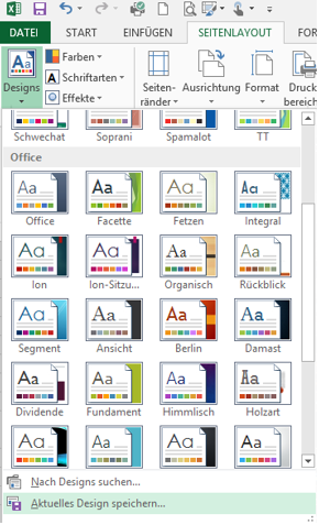 Das Gesamtpaket speichern Sie nun: dritte Registerkarte > Designs > Aktuelles Design speichern. Geben Sie dem Design einen aussagekräftigen Namen. Ab sofort wird es in jedem Ihrer Office-Programme, unabhängig davon, in welchem Sie es angelegt haben, im Design-Menü über den Office-Designs als benutzerdefiniertes Design angezeigt werden.