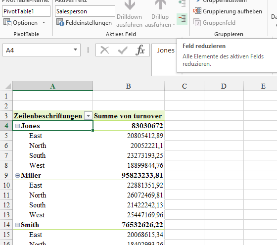 Klar! Markieren Sie ein Element der Ebene, auf der Sie reduzieren wollen, und gehen Sie auf PIVOTTABLE-TOOLS > ANALYSIEREN > Aktives Feld > Feld reduzieren.
