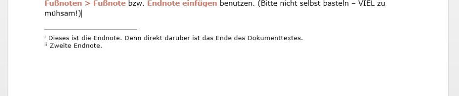 Sie haben noch ein paar Nebenbemerkungen zu Ihrem Text, die aber mittendrin unangebracht sind? Benutzen Sie Fuß- und Endnoten! Alles lässt sich leicht einfügen und wird automatisch formatiert, wenn Sie VERWEISE > Fußnoten > Fußnoten bzw. Endnote einfügen benutzen. (Bitte nicht selbst basteln – VIEL zu mühsam!)