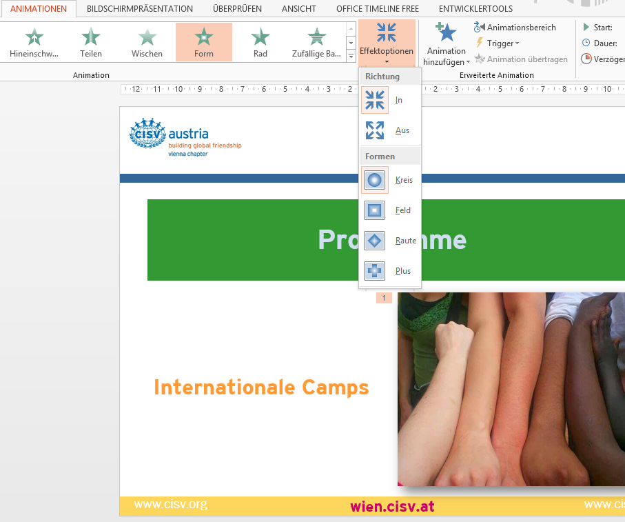 Wählen Sie nun einen Animationseffekt, der das, was Sie visualisieren wollen, besonders gut unterstreicht. Er sollte gerade so „wild“ sein, dass er nicht verstörend wirkt. Details können Sie noch unter ANIMATIONEN > Animation > Effektoptionen festlegen (es muss ja nicht alles von unten einfliegen).