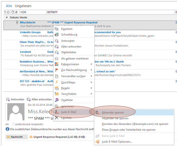 Klicken Sie mit der rechten Maustaste auf das besagte E-Mail von Miss Kelechi, und wählen Sie im Menü Junk-E-Mail > Absender sperren.