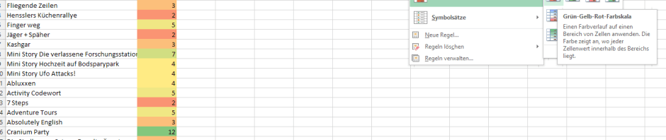 Heute wollen wir auf einen Blick sehen, welches die Renner darunter sind. Mit einer der START > Formatvorlagen > Bedingte Formatierung > Farbskalen ist das ganz leicht: Markieren Sie den Punktehaufen und suchen Sie sich eine Skala aus. Niedrige Werte bekommen die untere Farbe, hohe die obere. In diesem Beispiel sind also die grünen Spiele die beliebtesten (und es ist nur ein Beispiel, was wirklich herauskommt, bleibt streng geheim!)