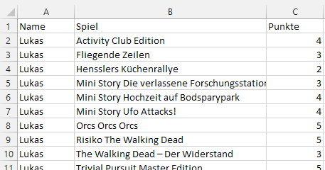 Die Kinder werden losgeschickt, dürfen Spiele testen und Punkte vergeben. Anschließend möchten die Erziehungsberechtigten (und Weihnachtsgeschenkverantwortlichen) gerne wissen, was wie gut angekommen ist … Nun hat aber jedes Kind seine eigene Liste geführt (aufgebaut sind sie alle gleich):