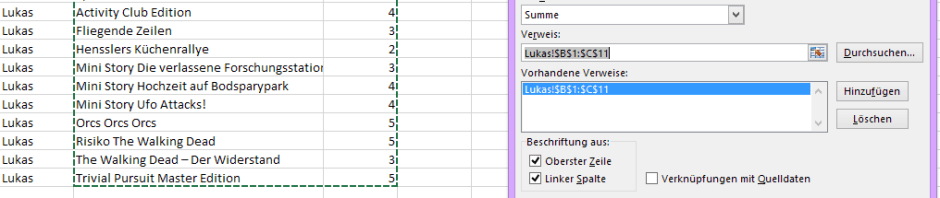 Da die Überschrift beibehalten wird, brauchen wir noch ein Hakerl bei Oberster Zeile, und auch eins bei Linker Spalte, denn darin steht in den ausgewählten Bereichen das Spiel, und nach dem Spielenamen sollen die Listen zusammengeführt werden. OK.