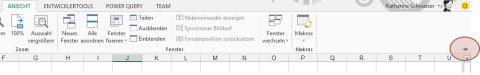 An der selben Stelle befand sich nun übrigens etwas, das vielleicht die Ursache allen Übels … der kleine Pfeil bewirkt das Lösen des Menübands – eben, dass nur noch die Registerkarten sichtbar sind …