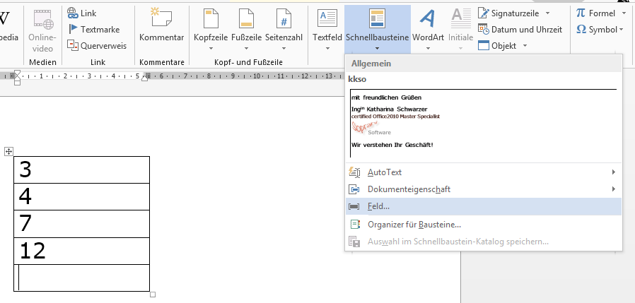 Der Weg dorthin ist steinig – aber immer noch einfacher, als alles in den Tischrechner zu klopfen: Stellen Sie den Cursor in die Zelle unterhalb der Zellen, die die Zahlen beinhalten. Benutzen Sie die Funktion EINFÜGEN > Text > Schnellbausteine > Feld.