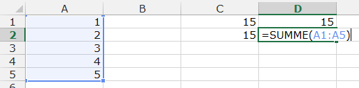 Mit der Formel =SUMME(A1:A5) liefert Ihnen Excel die Summe der Werte im Bereich von A1 bis A5. Wenig Arbeit für Sie, und Excel kommt wunderbar damit zurecht.