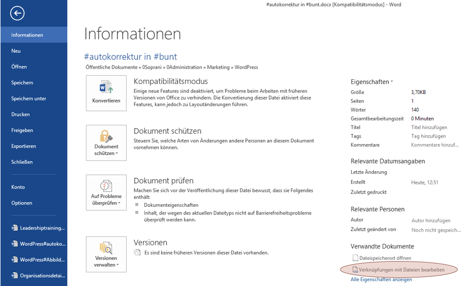 So, also die verknüpften Bilder. Sie brauchen ein letztes Mal eine aktive Internetverbindung. Auf DATEI > Informationen > Verwandte Dokumente finden Sie den Einstieg zu Verknüpfungen mit Dateien bearbeiten.