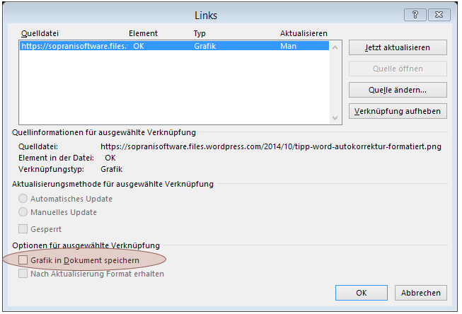 Im folgenden Dialog gibt’s die Option für ausgewählte Verknüpfung, bei der Sie ein Hakerl setzen müssen: Grafik in Dokument speichern.