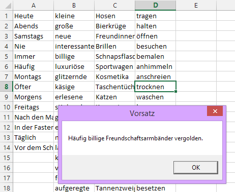 In die Spalten A bis D kommen beliebig viele Zeitergänzungen / Adjektive im Plural / Nomen im Plural / Verben im Infinitiv. (Bezüglich dieser Fachwörter fragen Sie Ihre Kinder 🙂 ). Der Rest ist Programmierung – also ab in die VBA-Oberfläche (am besten mit Alt+F11), und dann folgenden Code in das Modul zur Tabelle1 kopiert: