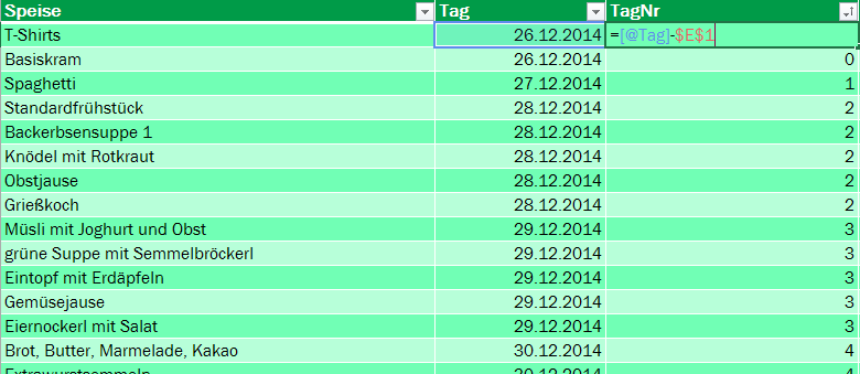Also: [@Tag] bedeutet: „Das, was in derselben Zeile in der Spalte steht, deren Überschrift Tag ist“, und in E1 hab ich den Camp-Vorabend hineingestellt, und die Dollarzeichen sind da, damit es immer E1 ist, und nicht „verrutscht„. Und wenn ich vom eingetragenen Tag den Camp-Vortag einfach subtrahiere, dann kommt genau heraus, der wievielte Camptag es ist.