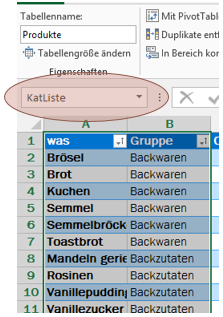 Einheit: wird gar nicht geschrieben, sondern aus der Produkte-Tabelle geholt, und zwar mit der Formel =SVERWEIS([@was];Produkte[#Alle];5;FALSCH). SVERWEIS schlägt nach, was in der fünften Spalte der Produkte-Tabelle steht, und zwar in der Zeile, in der in der ersten Spalte das steht, was hier in der Spalte mit der Überschrift was zu finden ist. FALSCH bedeutet nur, dass genau gesucht werden soll (also nicht die Einheit aus der Semmel-Zeile geliefert wird, wenn nach Semmelbröckerl gesucht wird) – und wenn ein Produkt nicht gefunden wird, dann sehen Sie den Fehler #NV und müssen das Produkt eben noch in der Produkte-Tabelle ergänzen.