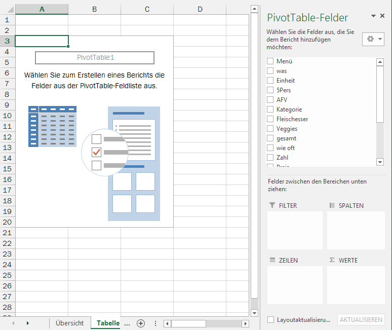 Keine Sorge: das ist nicht weiter schwierig 🙂 Schauen wir uns den Aufgabenbereich doch einmal näher an: Da gibt’s eine Liste der Pivot-Table-Felder, und die kennen Sie: es sind die Spaltenüberschriften aus der Tabelle, von der Sie ausgegangen sind. Also alles ganz vertraut 🙂 Und darunter? Vier leere Bereiche, und die Anweisung, Sie mögen Felder zwischen den Bereichen unten ziehen. Einer dieser Bereice ist mit dem Summenzeichen und dem Wort WERTE übertitelt … und da hinein sollen wir nun ein Feld ziehen … vielleicht wird davon dann die Summe gebildet? Probieren Sie’s: ziehen Sie eines der Felder, das Zahlenwerte enthält, auf den Bereich unten. Ich mach’s mit der Zahl vor, sie enthält ja die Menge, die für unser Camp jeweils gekauft werden soll. Ok, jetzt haben wir die Gesamtsumme aller Mengen – das ist noch nicht ganz das, worauf wir hinaus wollten, aber es wird schon.