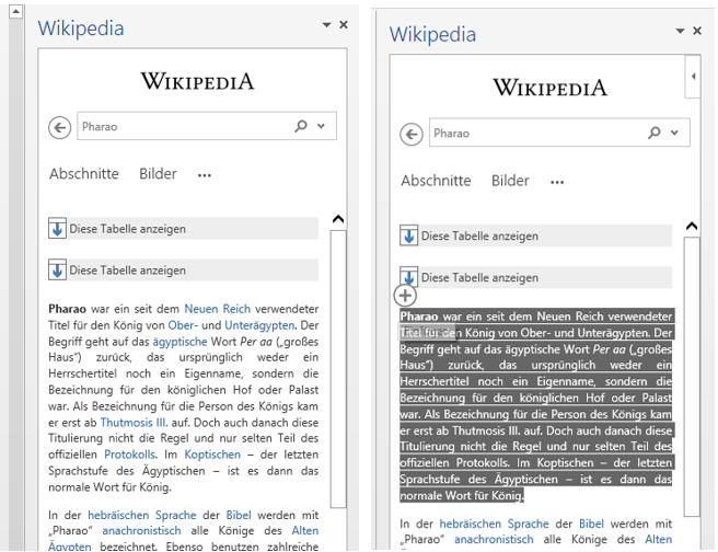 und ein Mausklick bringt Ihnen die Wissenswelt direkt in Ihren Aufgabenbereich. Suchbegriff Pharao eingeben, Lupe drücken, und die Informationen sind zum Greifen (und Kopieren – Markieren und Pluszeichen drücken 🙂 ) nah.