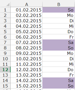 Dazu benötigen wir die Funktion WOCHENTAG und die bedingte Formatierung. Zuerst der WOCHENTAG: WOCHENTAG(Datum;2) liefert eine Zahl, die den Wochentag des übergebenen Datums kennzeichnet, und zwar 1 für den Montag, 2 für den Dienstag, … Verantwortlich für die Art der Nummerierung ist der 2er in meinem Beispiel; es gibt auch andere Nummerierungen, die für uns allerdings etwas weniger nützlich sind.