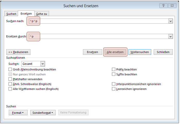 Löschen geht, natürlich, wenn aber viele von den Bösewichtern herumlaufen, wird das mühsam. Wir wollen sie auf einen Schlag erledigen, und das Werkzeug dafür finden Sie unter START > Bearbeiten > Ersetzen (auch mit Strg+H aufzurufen).