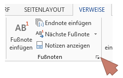 Es gibt nicht nur Fußnoten, die ich Ihnen gestern gezeigt habe, sondern auch Endnoten – die sind dann nicht am Seitenende, sondern am Ende von … ja, das können Sie sich aussuchen. Einfügen von Endnoten geht mit VERWEISE > Fußnoten > Endnote einfügen, und die Details geben Sie im Fuß- und Endnoten-Dialog an. Dieses Dialogfeld öffnen Sie mit einem Klick rechts unten in der Gruppe VERWEISE > Fußnoten: