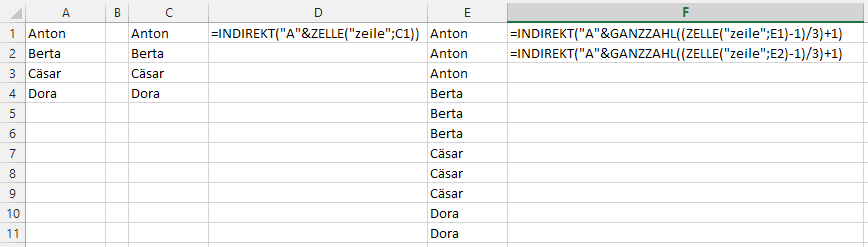 ZELLE(„zeile“;E1) liefert nämlich die Zeilennummer der Zielzelle. Zieht man davon 1 ab, dividiert das Ergebnis durch 3 (die Anzahl der gewünschten Wiederholungen), nimmt davon den ganzzahligen Teil (was die Funktion GANZZAHL erwartungsgemäß tut), und zählt man dann 1 dazu, bekommt man genau die Zeilennummer der gewünschten Quellzelle.