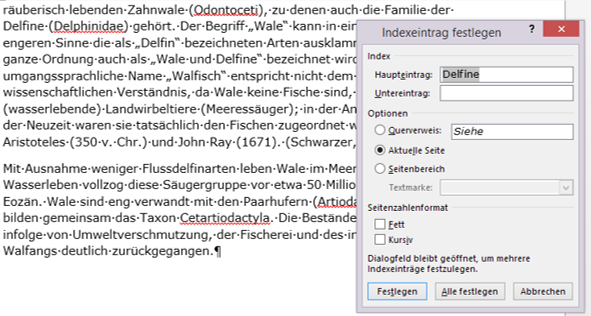 Bestätigen Sie’s mit Festlegen. Das Dialogfeld bleibt geöffnet, damit Sie gleich noch mehr Indexeinträge machen können, wenn Sie wollen – Markieren – Festlegen, Markieren – Festlegen, … In Ihren Text sind die Indexeinträge nun als Felder eingefügt,