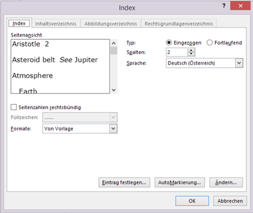 Und jetzt? Jetzt gehen Sie an die Stelle, an der Sie den Index eingefügt haben wollen (zumeist ist das das Dokumentende; zumindest werden Ihre Leserinnen und Leser dort danach suchen). VERWEISE > Index > Index einfügen erzeugt jetzt (nach ein paar Fragen in einem Dialogfeld) den Index.
