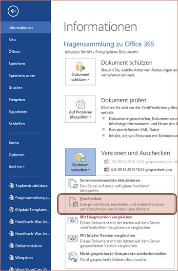 Ein ausgechecktes Dokument lässt sich übrigens auch während des Bearbeitens wieder Einchecken, oder Sie verwerfen das Auschecken, und lassen einfach andere BenutzerInnen mitarbeiten. Wo? Na, da: DATEI > Informationen > Einchecken