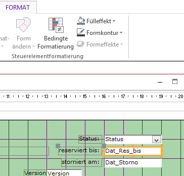 Jetzt aber! Wenn Sie ein Steuerelement haben, das sich abhängig von seinem Inhalt verändern soll, können Sie manche Formateigenschaften per bedingter Formatierung verändern. Wählen Sie dazu das betreffende Steuerelement aus (ich hab ein reserviert bis-Feld dafür ausgewählt, das rot werden soll, wenn der Reservierungszeitpunkt überschritten ist) und öffnen Sie den Dialog mit FORMAT > Steuerelementeformatierung > Bedingte Formatierung.