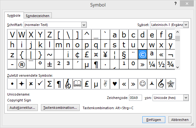 Zu langwierig? In diesem Dialog finden Sie auch die passende Tastenkombination, wenn es eine gibt (für das Copyright-Zeichen ist das Alt+Strg+C), oder Sie legen mit dem Button Tastenkombination… eine an.