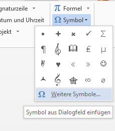 Jetzt, wo alles klar ist, fragt sich nur noch: wie kommen diese Zeichen in Ihren Text? Ein Weg dazu führt natürlich über die Registerkarten: EINFÜGEN > Symbole > Symbol > Weitere Symbole … (den letzten Schritt ersparen Sie sich, wenn Sie das Symbol schon öfter benutzt haben; dann steht es gleich im Menü zur Auswahl).