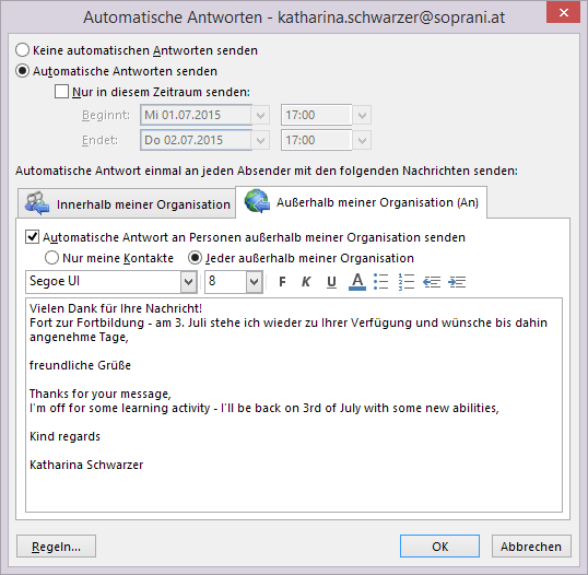 Geben Sie hier an, dass Sie Automatische Antworten senden möchten – ab sofort, oder planen Sie voraus mit Nur in diesem Zeitraum senden:. Innerhalb meiner Organisation müssen Sie eine Nachricht angeben, die dann alle aus Ihrem Unternehmen bekommen (möglichst kurz und informativ, wenn Sie Ihre Mails auf einem Exchange-Server lagern, denn diese Nachricht wird demjenigen, der Ihnen schreibt, schon vor dem Senden angezeigt).