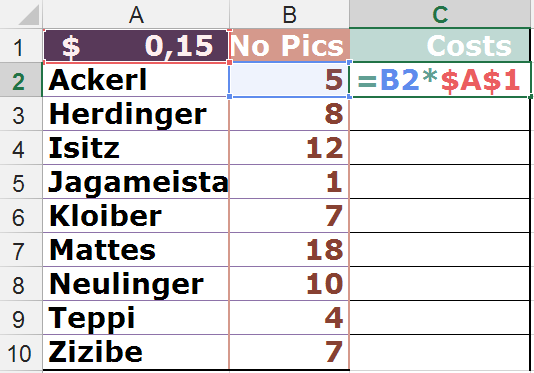 So if we drag the Formular downwards in order to fill in the rest of the Costs fields, B2 evolves into B3, B4, …, but $A$1 always refers to A1. See: