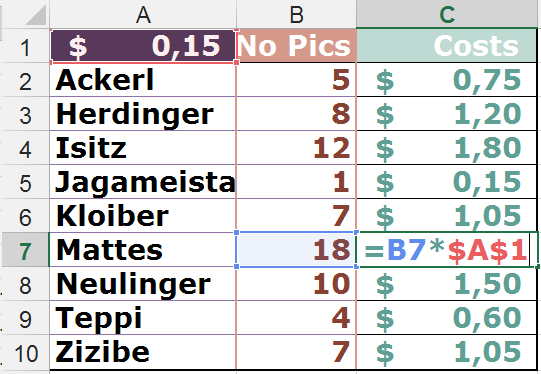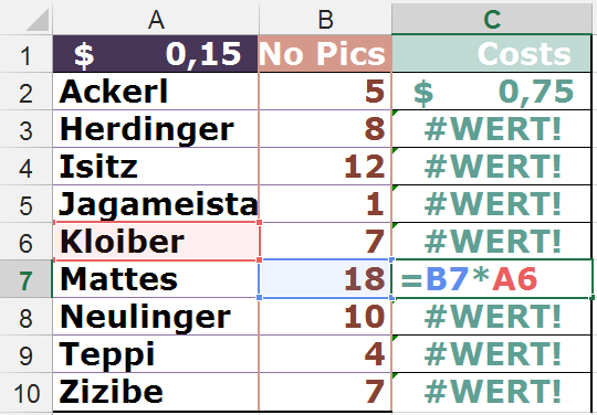 If I had forgotten to add the $, the first formula would have had the same result. But then there would have been errors. Why? Because you can’t multiply B7 with Kloiber, and so can’t Excel.