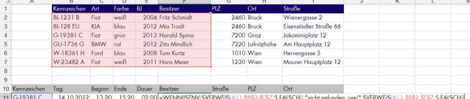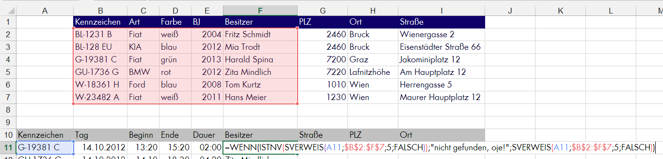 SVERWEIS(A11;$B$2:$F$7;5;FALSCH) ist der SVERWEIS, der für den Verweis auf die zweite Liste benutzt wird. Hier wird der Inhalt von A11 im Bereich B2:F7 gesucht, der Inhalt der 5. Spalte wird zurück gegeben, falls er gefunden wird, andernfalls gibt’s den #NV!–Fehler (dafür sorgt FALSCH).
