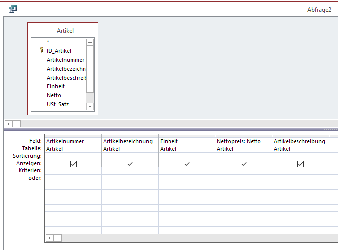 Das Umbenennen ist denkbar einfach: Sie schreiben in der Feld:-Zeile des Definitionsbereichs den gewünschten neuen Feldnamen vor den alten Feldnamen, gefolgt von einem Doppelpunkt. Nun steht da z.B. Nettopreis: Netto.