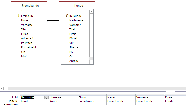 Das Feld Vorname kommt in beiden Quelltabellen vor. Daher muss es bei der Ausgabe mit dem Tabellennamen und einem Punkt qualifiziert werden, damit keine Verwechslungsgefahr besteht. Also: Kunde.Vorname, Fremdkunde.Firma, …