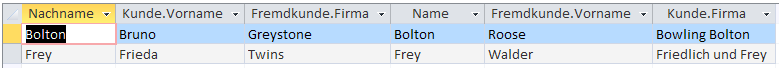 Wir stellen uns die Frage, ob es in der Tabelle Fremdkunde Einträge gibt, deren Name einem Nachnamen in der Tabelle Kunde entspricht. Dazu fügen wir zu einer neuen Abfrage die beiden Tabellen hinzu und erstellen eine Beziehung zwischen den beiden Feldern, die gleich sein sollen. Nun ziehen wir die Felder, die wir anzeigen wollen, in den Definitionsbereich. So.