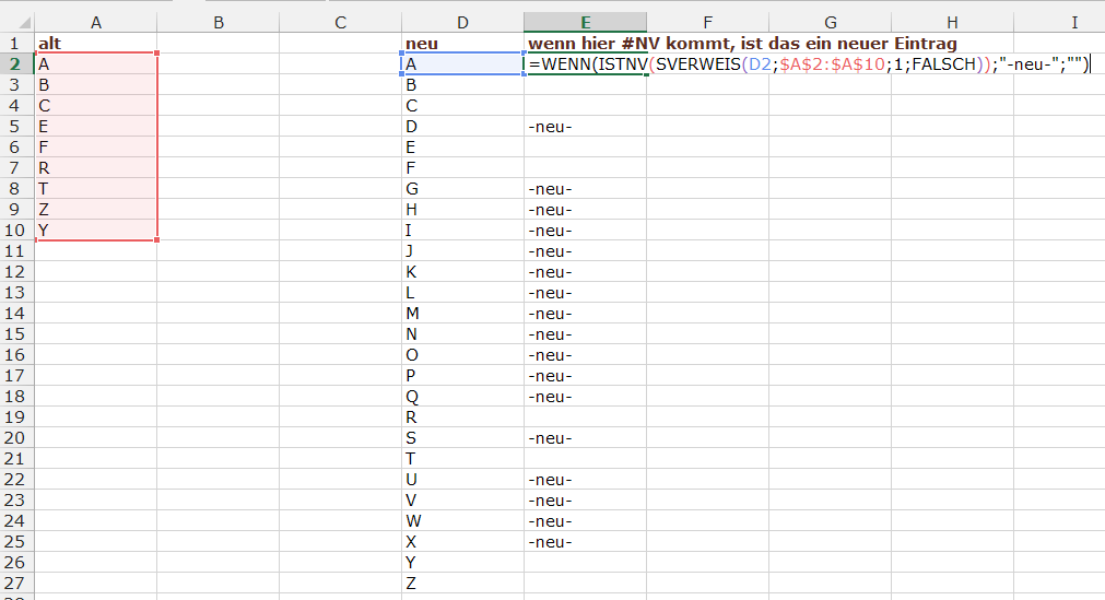 =WENN(ISTNV(SVERWEIS(D2;$A$2:$A$10;1;FALSCH));„-neu-„;„“)
