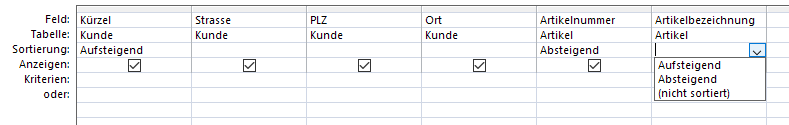 Die Datensätze werden dann nach Kürzel aufsteigend ausgegeben; wenn mehrere Datensätze dasselbe Kürzel enthalten, werden sie noch nach Artikelnummer absteigend sortiert. Und gibt es Datensätze mit dem selben Kürzel und der selben Artikelnummer, so wird noch die Artikelbezeichnung herangezogen – die Reihenfolge wird soeben ausgewählt.