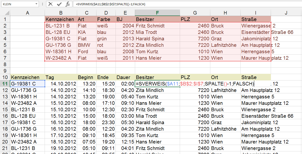 um 1 kleiner ist als die Nummer der aktuellen Spalte (für den Besitzer brauchen wir beispielsweise den Inhalt der fünften Spalte aus B2:I7, die Formel steht in der sechsten Spalte des Blattes, daher müssen wir eins abziehen) - nur exakte Treffer ermittelt werden (das macht das FALSCH)