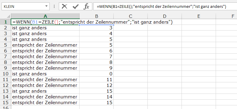 Ein Beispiel für die Verwendung von ZEILE() hab ich Ihnen schon am Montag geliefert. Ein weiteres: =WENN(B1=ZEILE();„entspricht der Zeilennummer“;„ist ganz anders“) liefert Ihnen die Information, ob das, was in B1 (B2, B3, …) steht, der aktuellen Zeilennummer der Funktion entspricht.