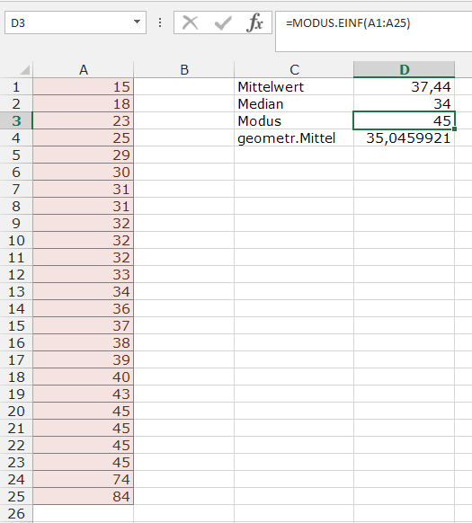 Statistik ist doch lustig. Heute schauen wir uns einen anderen aussagekräftigen Wert an als die beiden „Mitten“werte der vergangenen Tage. Manchmal ist der interessanteste Wert der, der am häufigsten vorkommt – also weder arithmetisches Mittel noch Median. Der Wert heißt Modus – und, erraten, auch den können Sie mit einer Funktion ermitteln, sie heißt – täterätäää – MODUS.EINF(Bereich). Das .EINF steht dabei für einfach – Sie bekommen den ersten Wert geliefert, falls mehrere Werte gleich häufig vorkommen. In unserem Beispiel ist 45 der häufigste Wert – das heißt, ein ganzes Grüppchen von Menschen hat je 45 Stunden gearbeitet. Vielleicht ein Team?