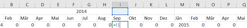 Das heißt: Beziehen Sie sich in einer Formel auf B1, C1, …K1, L1, so wird immer 0 zurückgegeben. A1, M1, Y1 enthalten in diesem Beispiel als einzige Zellen Werte.