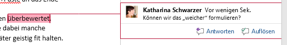 Word bietet Ihnen dazu eine Kommentarfunktion: Wählen Sie das Wort, den Absatz, die Position aus, zu der Sie etwas anmerken wollen, und starten Sie den Kommentiervorgang mit EINFÜGEN > Kommentare > Kommentar.