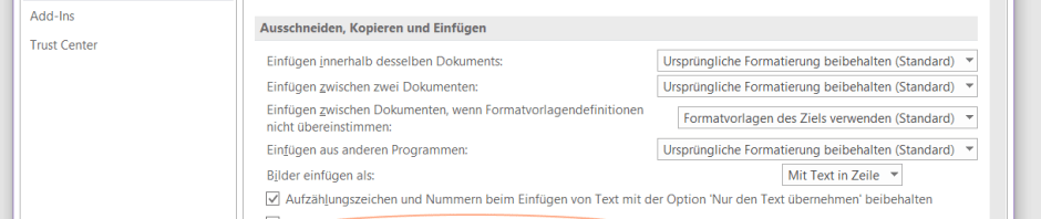 Gehen Sie in DATEI > Optionen > Erweitert zum Abschnitt Ausschneiden, Kopieren und Einfügen. Hier findet sich die Einstellung Schaltfläche für Einfügeoptionen anzeigen, wenn Inhalt eingefügt wird.
